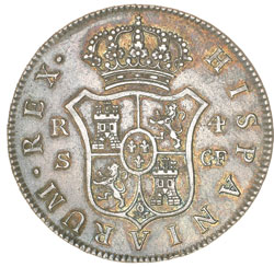 SPAIN, Charles III, four reales, Seville Mint, 1773 CF (KM.413.2). Attractive fields and blue and red patination, nearly extremely fine and rare in this condition.