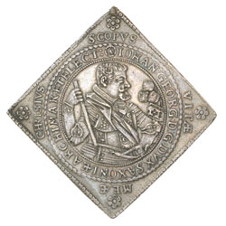 GERMANY, Saxony, John George klippe thaler, 1630 (KM. 414) marriage of Maria Elizabeth, daughter of John Georg and frederich III (28.8 g). Trace of solder at top apex otherwise oned good very fine and rare.