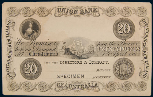 NEW ZEALAND, Union Bank of Australia, second issue, uniface printer's proof by Perkins Bacon & Co., twenty pounds, Christchurch, 1st April 186 - black on white paper, specimen overprinted in signature reserve, pencilled Sept 12th 1863 bottom margin, corners cut as issues (P.S 349; Robb 34e). Extremely fine.