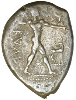 ITALY, Bruttium, Caulonia, silver stater, 460-450 B.C. (Kraay chronology), (7.022 grams), obv. Apollo naked walking ...