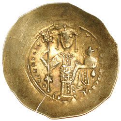 NICEPHORUS III, (A.D.1078-1081), electrum gold histamenon nomisma (scyphate), Constantinople mint, (4.61 grams), obv. bearded Christ enthroned no back, facing, wearing nimbus, raising right hand, in left hand the Gospels, IC XC across, double dotted border, rev. +NIKH**F D*EC T W ROTANIAT, around bust of Nicophorus facing, bearded wearing crown and loros, holding labarum with X on shaft and globe with cross, (S.1881, DOC 3, BMC 7-11, R.2051-2). Good bust of bearded Christ, good very fine and scarce.