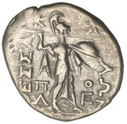 THESSALY, Thessalian League, (196-146 B.C.), silver stater or double victoriatus, (5.834 grams), Larissa mint, obv. head of Zeus to right, crowned with oak leaves, behind **[SI]MIOU*, rev. Athena Itonia advancing to right, brandishing spear and holding shield, on sides **[Q]ESSA LWN*, above two stars, either side of figure **P O/ L E*, (cf.S.2232, McClean 4716, SNG Cop. 294), Very fine or better, well centred, and rare.