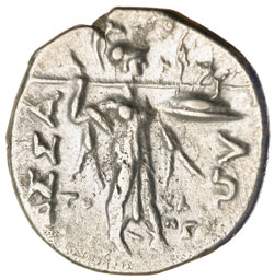 THESSALY, Thessalian League, (196-146 B.C.), silver stater or double victoriatus, (6.21 grams), Larissa mint, obv. head of Zeus to right, crowned with oak leaves, behind **[M]ANDRO/[S]QENOUS*, rev. Athena Itonia advancing to right, brandishing spear and holding shield, on sides **QESSA LWN*, above across **A IRS* (sic), on either side of figure TO **KL/H*C, (cf.S.2232, McClean 4850, cf.SNG Cop. 292), Bright, good very fine, well centred, and rare.