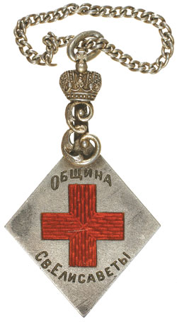 RUSSIA, Jeton for Red Cross Society of Elizabeth under the auspices of Grand Duchess Elizabeth. Silver and enamel (43x26mm) named on reverse. Engraved. Very fine.