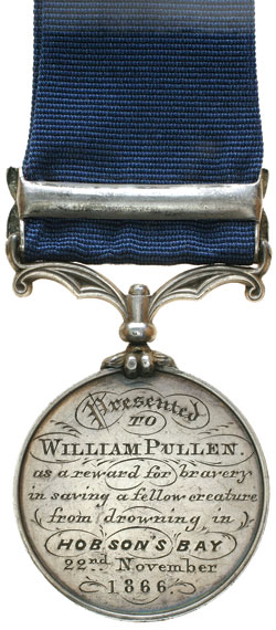 LIFE SAVING MEDAL, 1866, in silver using a China War Medal 1857, with the reverse image of medal being skillfully removed by machining, then inscribed 'Presented / to / William Pullen / as a reward for bravery / in saving a fellow creature / from drowning in / Hobsons Bay / 22nd November / 1866'. Possibly the earliest award medal for life saving in Victoria, very fine and unique.