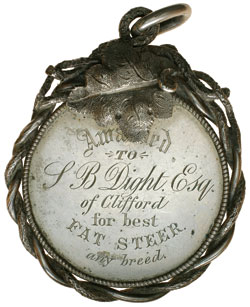 NORTHERN AGRICULTURAL ASSOCIATION, Singleton Show, 1871, in silver (47mm), plain silver disc engraved both sides with a twisted rope surround and grape leaf finial and suspension ring, inscribed on obverse 'Northern Agricultural / Association / Singleton Show / 16th August 1871' and on reverse 'Awarded / to / S.B.Dight Esq / of Clifford / for best / Fat Steer / any breed'. Extremely fine and rare.