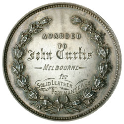 CALCUTTA INTERNATIONAL EXHIBITION, 1883-84, award medal in silver (51mm) inscribed on reverse 'John Curtis / Melbourne / for / Solid Leather / Portmanteaus'. With case of issue. Good extremely fine.