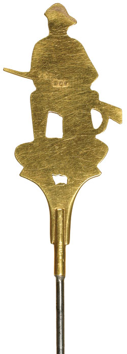 BOER WAR, patriotic hat pin, in gold (9ct, 5gms, figure 28mm x 19.5mm, overall length 167mm), Boer Bushman kneeling on one knee, holding a rifle. Good extremely fine.