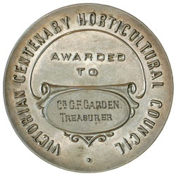 VICTORIA CENTENARY HORTICULTURAL COUNCIL, 1934, award medal in silver (50mm) by (Stokes) (C.1934/1), obverse, Combined ...