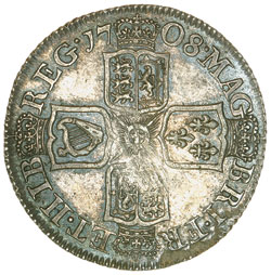 ANNE, after Union, shilling, third bust, 1708 (S.3610. ESC 1147). Planchet striation flaw on reverse, otherwise very fine.