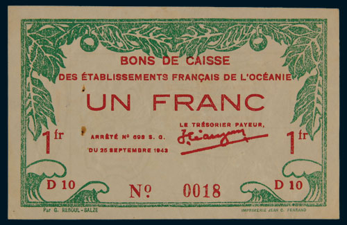FRENCH OCEANIA, Bons de Caisse, emergency issue, one franc, 25 September 1943, D10 No. 0018, with no circular violet hand stamp or embossed seal (P.11). Two rusty pinholes at left, very fine and very rare.
