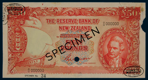 RESERVE BANK, G. Wilson (1955-56), specimen fifty pounds, No.34, 0/U 000000 (P.162b), imprint of Thomas de la Rue & Company Limited, London on back, SPECIMEN in black letters diagonally both sides, SPECIMEN/DE LA RUE & CO LTD/NO VALUE in black ovals, top left and bottom right corners both sides, one punch hole in signature. Glue marks on back and front, piece missing from right hand border, 12mm tear at top, graduating horizontal fold, otherwise very fine and very rare.