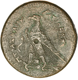 EGYPT, Kingdom of, Ptolemy IV, (221-204 B.C.), AE 40, drachm, (63.0 grams), Alexandria mint, obv. diademed head of Zeus Ammon to right, rev. eagle to left with closed wings, standing on thunderbolt, cornucopiae over shoulder, around **BASILEWS PTOLEMAIOU, between legs **SE*, dotted border, (S.7814, Sv. 992, BMC 69-71, SNG Cop. 205-6, Pitchfork 35-36, Koln 61 [attributes issue to Ptolemy III between 247-243 B.C.). About very fine, some surface roughness, scarce.