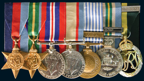 GROUP OF SEVEN: 1939-45 Star; Pacific Star; War Medal 1939-45; Australia Service Medal 1939-45; United Nations Korea Medal; Australian Service Medal 1945-75 - bar - Japan; Efficiency Decoration - bar - Australia. QX35957 J.F.Infield on first to sixth medals, QX35957 T/Capt J.F.Infield on the seventh (note the incorrect initial). First to fifth medals impressed, sixth pantographed and seventh engraved. Court mounted. Extremely fine.