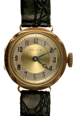 LADIES GOLD (9CT) ROLEX WRISTWATCH C1930S, manual wind, Rolex signed gold and white dial (18mm), case signed RWC Ltd, serial #57771, Rolex Prima movement, 15 Jewels, timed 6 positions for all climates, black leather bracelet.
