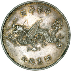 CHINA, Republic, General Issue, silver dollar, not dated (1916), obv. Yuan Shih-kai facing with plumed cap, and military uniform, rev. dragon to left, commemorating inauguration of Hung Hsien regime, (KM.Y.332 Kann 663). Golden blue patina, extremely fine or better and rare.