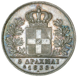 GREECE, Otto, five drachma, 1833 A (Paris) (KM.20) (Divo 10b). Blue grey toned good very fine/nearly extremely fine and rare.