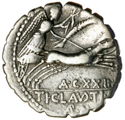 TI. CLAUDIUS, (c.79 B.C.), silver denarius, Rome mint, (3.486 grams), obv. Diana bust to right bow and quiver on shoulder, S.C. before, rev. Victory in biga to right, A.CXXIII below biga, TI CLAVD. TI.F/AP. N in exergue, (S.310, Cr.383/1, Syd.770, RSC Claudia 5).Good very fine and scarce.