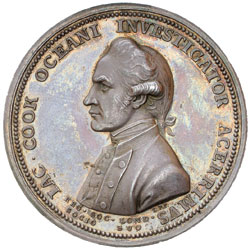 Cook had first seen the Americas when, as Master of the Mercury he surveyed the St. Lawrence River as part of General Wolf's expedition to capture Quebec. He continued to serve on the North American Station till 1767. He twice circumnavigated the globe, first in 1768-71 and later 1772-75. On his return he was elected a Fellow of the Royal Society. He had left on his third voyage in 1776 and was murdered by natives in the Sandwich Islands in 1779. The Royal Society issued this tribute medal in 1784 and struck examples of this medal in gold (19), silver (291) and bronzed copper (574). A specimen in gold was given to his widow and is now in the British Museum. The portrait was copied by John Flaxman when designing the well-known Wedgwood jasperware plaquette.