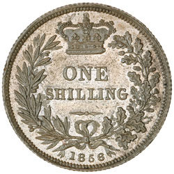 QUEEN VICTORIA, young head silver shilling, 1856, no WW, (S.3904, ESC 1304). Light peripheral tone, proof-like field, good extremely fine and rare.
