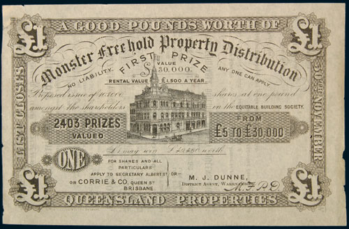 THE EQUITABLE BUILDING SOCIETY, Brisbane, Queensland, advertising proposal form in the design of an Australian pre Federaton one pound note, "Monster Freehold Property Distribution - A Good Pound's Worth of Queensland Properties". List closes 30th November 1893, vignette of the Queensland Deposit Bank building in centre, printed by Watson Ferguson & Co Ltd Brisbane. Nearly very fine and rare.