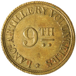 9TH LANCASHIRE ARTILLERY VOLUNTEERS, tokens in brass (25mm) (3), obverse, "9th" in centre, around, "Lancs. ...