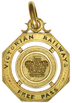 VICTORIAN RAILWAYS, Free Pass, handcrafted in gold (21ct, 19.7gms, 28mm x 23mm octagonal shape with small mount), inscribed on obverse 'Victorian Railways Free Pass' and on reverse 'South Aust Rlys Commission Member', manufactured by Kilpatrick & Co., Goldsmiths of 39 Collins St, Melbourne, in 1886, that Company being under the Vice-Regal patronage. With original case of issue, extremely fine and rare.