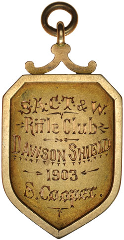 S(OUTH) A(USTRALIAN) C(OMMERCIAL) T(RAVELLERS) AND W(AREHOUSEMEN), Rifle Club, 'Dawson Shield' 1903, handcrafted medal in gold (15ct, 17.3gms, 27 x 43mm shield shaped) engraved on obverse 'Dawson / Shield / 1903' and on reverse 'S.A.C.T.& W. /Rifle Club / Dawson Shield / 1903 / S.Cooper'. Good very fine.