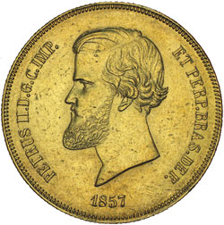 BRAZIL, Peter II, 20,000 reis, 1857 (KM.468). Hairline and surface marked otherwise nearly uncirculated.