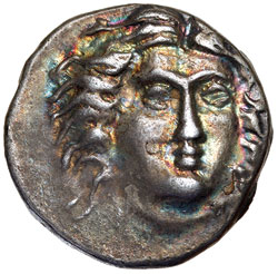 R. Ashton recently reattributed the Gorgos issues (including torch symbol issues) from Thessaly to Samothrace (see reference R. Ashton, above pp. 73-77). Ashton has argued persuasively that this coinage was struck by Perseus to pay Cretan mercenaries serving in his army. The Rhodian coinage circulated on Crete, and thus was a familiar and trusted currency for the Cretans, and it is likely that they would have required payment in that form (see also NC 1988, pp.29-30), and SM 146 (May 1987), p.34).
