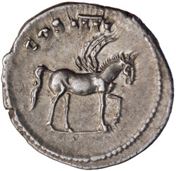 DOMITIAN, (A.D. 81-96), issued as Caesar under Vespasian, silver denarius, Rome mint, issued A.D. 76, (3.482 grams), obv. laureate head of Domitian to right, around CAESAR AVG F DOMITIANVS, rev. around COS IIII, Pegasus walking to the right, (S.2637, RIC V238, RSC 47). Extremely fine with mint bloom and very rare in this condition.