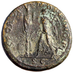 TRAJAN, (A.D. 98-117), AE sestertius, issued 105, Rome mint, (25.90 grams), obv. laureate bust draped on far shoulder to right of Trajan, around IMP CAES NERVAE TRAIANO AVG GER DAC P M TR P COS V P P, rev. Victory standing to left holding palm, erecting a trophy, with arms at base, around S P Q R OPTIMO PRINCIPI, S C in exergue, (cf.S.3201, RIC 525a, C.445). Some surface roughness, but otherwise nearly very fine and very scarce.