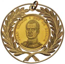 SPAIN, King Juan Charles I, gold medal (.900 fine) in an ornate gold (.900 fine) laurel wreath decorated frame, total weight 34.7gms. Extremely fine.