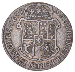 SCOTLAND, William and Mary, (1689-1694), silver ten shillings, Edinburgh mint, 1691 (ilustrated), (S.5659); five shillings, 1694 (S.5665); copper bawbee, 1691 (holed), bodle, 1694 (S.5666, 5674). Fair - good fine. (4)