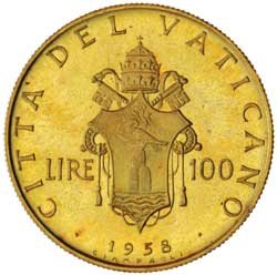 VATICAN CITY, Pius XII, one hundred lire 1958 (KM.A53). Uncirculated.