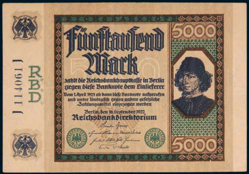 GERMANY, Weimar Republic, Reichsbanknote, 1922 third issue, five thousand marks, 16 September 1922 (P.77). Quarter ...