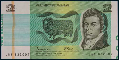 TWO DOLLARS, Johnston/Fraser (1985) LNB 822009 (R.89), registration shift on front and back of note. ...