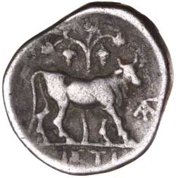 EUBOIA, Histiaia, (c.350-340 B.C.), silver drachm, (3.17 grams), obv. head of nymph Histiaia wreathed in ivy, rev. cow standing to right, vine with two bunches of grapes, **ISTI* in exergue, AY**G* monogram to right, (S.2494 [œ140], BMC 4, Lanz BCD Catalogue No.111, [lot 375, realised 350 Euros +], SNG Cop.516). Toned, good fine and rare.