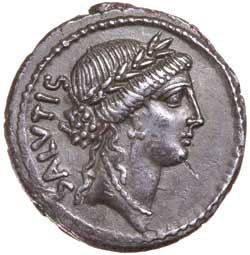 MAN. ACILIUS GLABRIO, (c.49 B.C.), silver denarius, Rome mint, (3.88 grams), obv. Salus laureate head to right, SALVTIS upwards behind, rev. Valetudo (Salus) standing left leaning against column and holding serpent, around MN ACILIVS III VIR VALETV, (S.412 [œ50 VF], Cr.442/1a, Syd.922, RSC Acilia 8). Toned, nearly extremely fine, scarce.
