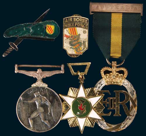 Together with U.S.Meritorious Unit Commendation still in original packet; miniature pair of first two medals with MID emblem and 1960- clasp, swing mounted; riband bar with first awards with MID emblem and 1960- clasp; Airborne Mike Force lapel badge; U.S.Special Forces Association badge, pin missing; RA Infy collar badges (2). Captain Brian Jackson A129298 Royal Australian Infantry Corps served in Vietnam with AATTV 23Sep1966 to 20Jul1967. MID LG 10Dec1968, CAG 18Apr1968. Citation, ’Captain Brian Jackson was commissioned in the Citizen Military Forces on 9th April 1957 and was posted to 31st Infantry Battalion. He continued his service with this unit until he enlisted for full-time duty, and was posted to the Australian Army Training Team, Vietnam in September, 1966. He was posted as Intelligence Officer of Detachment B-50, 5th Special Forces Group (Airborne) at Nha Trang. This special group was in its formative stages and he had to organize the entire intelligence effort of the unit, with no guide lines to follow and no other similar unit to copy. The now complete intelligence effort of Detachment B-50 is a direct result of Captain Jackson’s diligence, commonsense and sound judgment. He devised simple, but detailed procedures, for briefing and de-briefing reconnaissance teams, and the method of recording their information, originated by Captain Jackson, is now used by other units, with similar missions, in 5th Special Forces Group. The Planning, formation and maintenace of peak performance of the Intelligence Section of Detachment B-50 was due entirely to the diligent efforts, amd professional leadership qualities displayed by Captain Jackson. He has brought great credit to himself, his unit, and the Australian Military Forces.’ With research.
