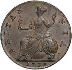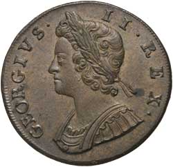 GEORGE II, young head, copper halfpenny, 1731 (S.3717). Subdued mint bloom, red brown patina with traces of original mint red, nearly uncirculated.