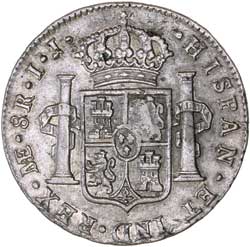 GEORGE III, emergency issue, silver dollar, oval countermark of George III bust on Charles IIII ...