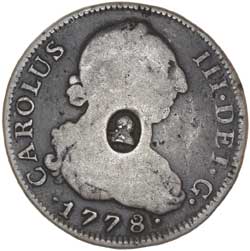 GEORGE III, emergency issue, silver half dollar, Spanish four reales of Charles III, 1778, Madrid Mint, with oval counterstamp of George III (S.3767). Counterstamp very fine, host coin very good - fine.