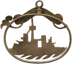 H.M.S. Dreadnought, handmade sweetheart pendant in 9ct gold (1.6gms, 20mm x 26mm), small ornamental leaf missing at left side (easily repairable by jeweller). Very fine.