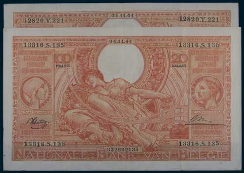 BELGIUM, Banque Nationale de Belgique, one hundred francs (twenty belgas), 04.11.44, French and Flemish text. (P.113, 114). Light folds, extremely fine and scarce. (2)