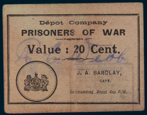 FRANCE, World War I, POW, Depot Company, twenty and forty cents (C.4879, 80); Le Harve POW Camp, five and ten cents, one, two and five francs (unlisted in Campbell). Interesting and rare group, fine - nearly extremely fine. (7)
