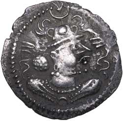 These Hunnic imitations of Sassanian coins are known from a small number of specimens and are rarely seen for sale. This example has completely corrupt Pahlavi letters on obverse and reverse, and probably from the slightly later period of c.600 A.D. The Hephthalites or White Huns were a Central Asian nomadic confederation whose precise origins and composition remain obscure. They were called Ephthalites by the Huns, and Hunas by the Indians. They were mentioned by the Chinese and they displaced the Scythians and conquered Sogdiana and Khorasan before 425. After that, they crossed the Syr Darya (Jaxartes) River and invaded Persia. In Persia, they were initially held off by Bahram Gur but later around A.D. 483-85, they succeeded in making Persia a tributary state. After a series of wars in the period around A.D. 503-513, they were driven out of Persia and were completely defeated in A.D. 557 by Khosru I though their polity came under the Gokturks thereafter. The White Huns also invaded the regions of Afghanistan and Pakistan and succeeded in extending their domain to include the Ganges valley where this coin was made.