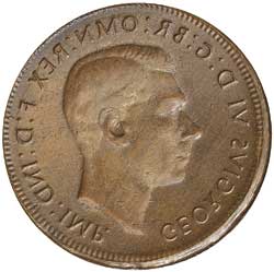 GEORGE VI, penny, 1949, struck five percent off centre and out of collar. Very fine. ...