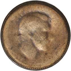 GEORGE VI, halfpenny (1945-7 Perth Mint) full obverse brockage, legends weakly struck. Light red colour, nearly uncirculated and rare.