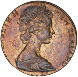NEW ZEALAND, Elizabeth II, two cents, 1983, struck on a one cent blank. Red and brown uncirculated and rare.